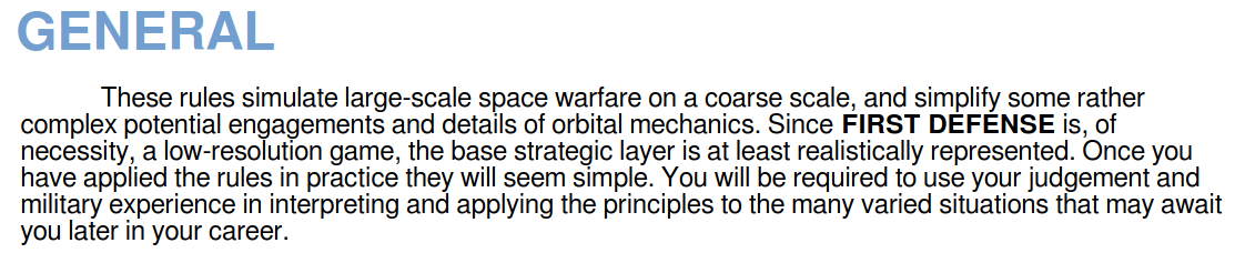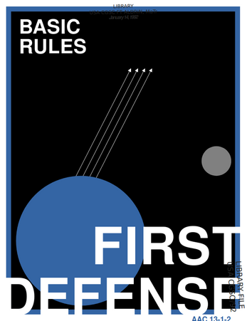 The FIRST DEFENSE simulation wargame is designed to exercise United States Space Corps officers and enlisted men in the control and coordination of ground, Lunar, and spaceborn assets across multiple operational theaters, with varying levels of international cooperation, and against multiple threat profiles.